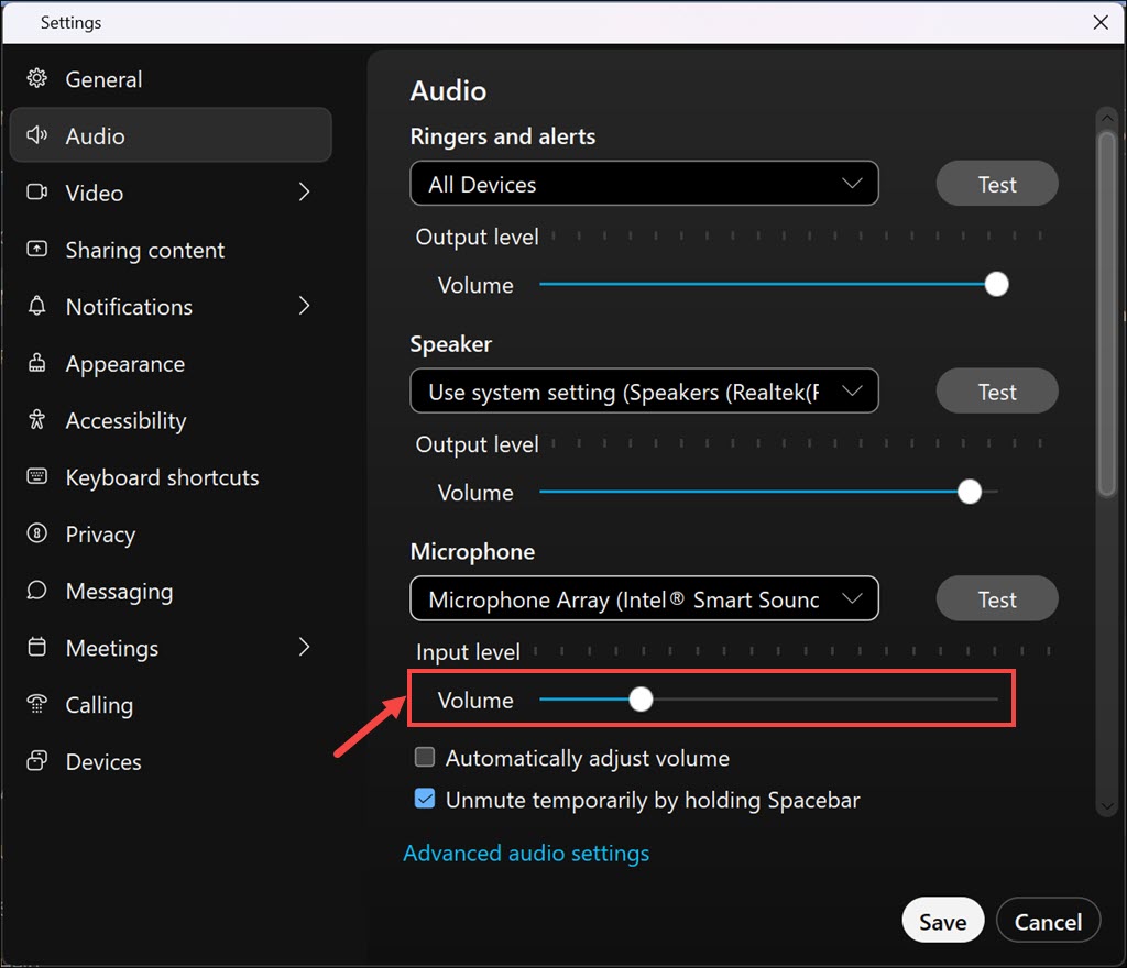 音量設置:Windows 11 和 Webex 中不正確的麥克風輸入音量設置可能會導致麥克風問題。