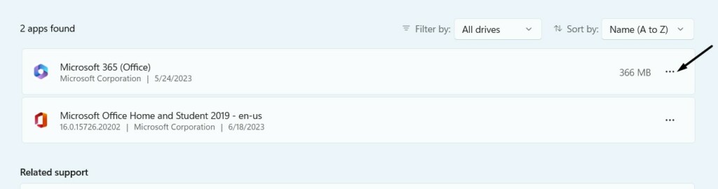 1.搜尋微軟辦公軟件在應用程式的部分設定並單擊三點 (...)在它旁邊。