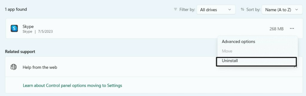 3.找到後,單擊三點 (...)在應用程序旁邊並選擇解除安裝從菜單中。