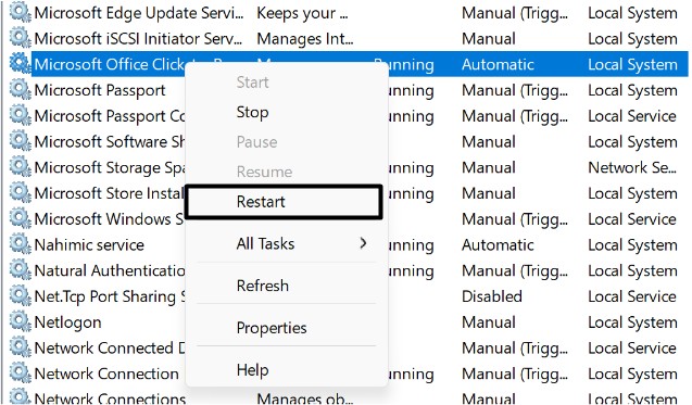 因此,我們建議您重新啟動它並查看它是否允許 Microsoft Office 更新而不粘連。您可以嘗試上述步驟來了解如何重新啟動此 Microsoft Office 服務:
