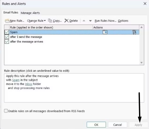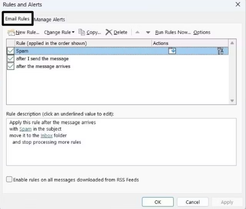 4.如果您可以在電子郵件規則選項卡,取消選中它旁邊的框。