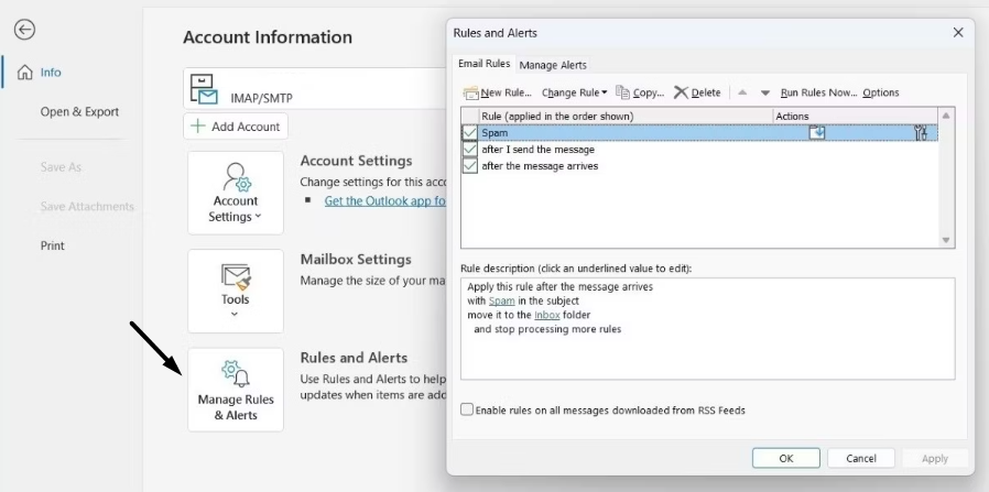 3.前往電子郵件規則的選項卡規則和警報提示並檢查與通知相關的規則。
