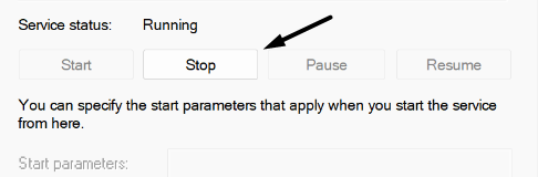 3.選擇特性菜單中的選項,然後單擊停止按鈕下服務狀態: