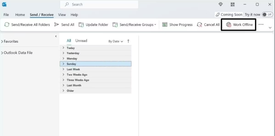 2.在發送/接收選項卡,單擊離線工作頂部菜單中的選項可將其關閉。