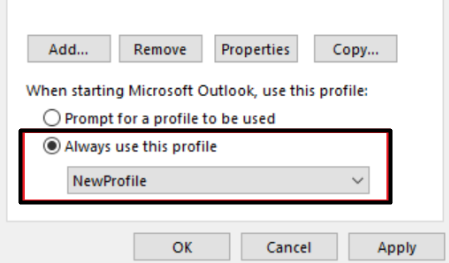 4.選擇始終使用此配置文件單選按鈕並從下拉列表中選擇新的郵件配置文件。