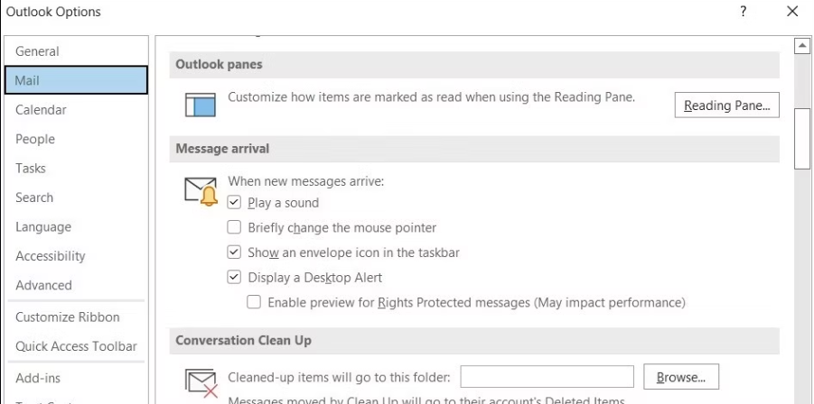 Microsoft Outlook 通知在 Windows 11 中不起作用的常見原因之一是已禁用 顯示新郵件桌面代理警報選項。