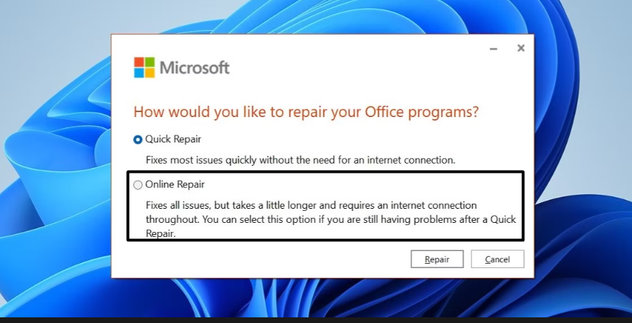 6.如果沒有,請再次執行相同的步驟,這次選擇在線維修而不是快速修復。