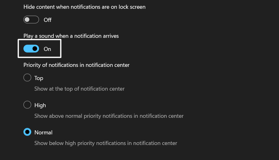 6.最後,確認通知到達時播放聲音開關打開,並且行動中心通知的優先級選項 設置為頂部。