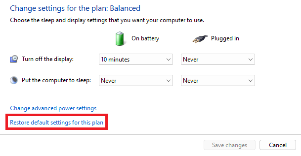 5.在下一個屏幕上,選擇恢復此計劃的默認設置並單擊是的確認彈出窗口上的按鈕。