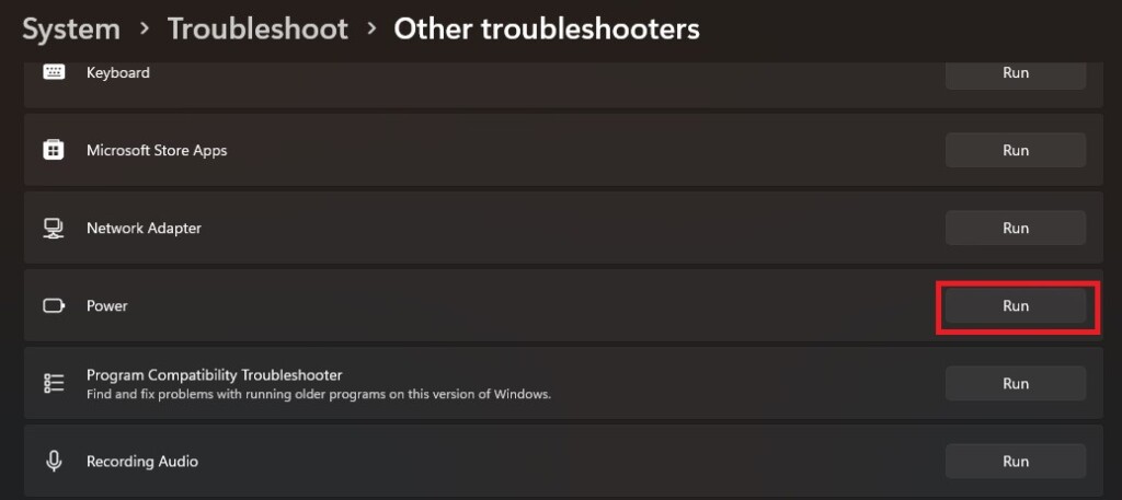 4.向下滾動並單擊跑步按鈕旁邊的力量疑難解答。