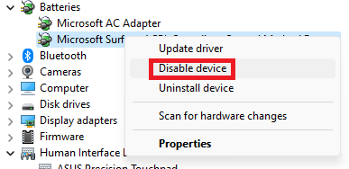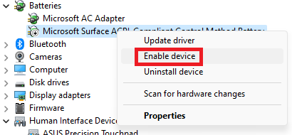 3.右鍵單擊Microsoft Surface ACPI – 兼容控制方法電池並選擇禁用設備。