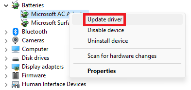過時或損壞的電池驅動程序也可能導致 Windows 11 中未檢測到電池錯誤。解決此問題的一個簡單方法是更新電池驅動程序。更新電池驅動程序時,您可以為筆記本電腦提供與電池通信的最新軟件,這也可以解決檢測錯誤。