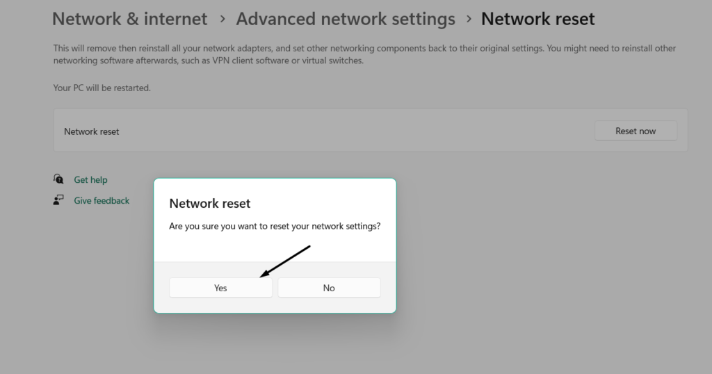 5.最後,點擊是的在新的提示中向電腦發出確認以重置網絡設置。