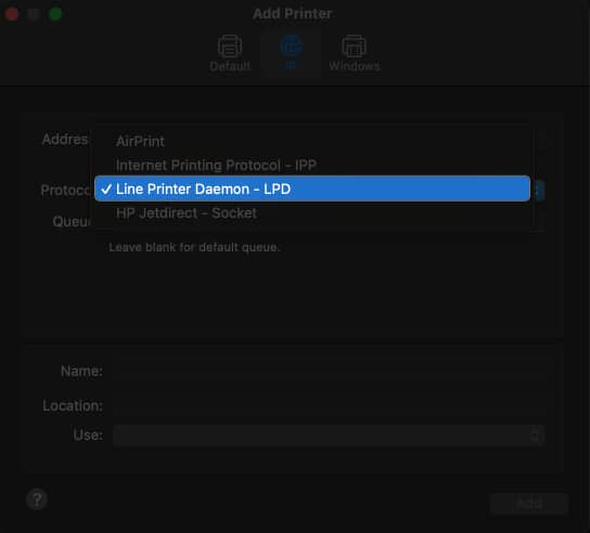 對於舊打印機的用戶或之前通過 AirPrint 設置打印機但仍面臨打印機加密憑據過期問題的用戶,請使用 LPD(行式打印機守護程序)協議重新安裝打印機。