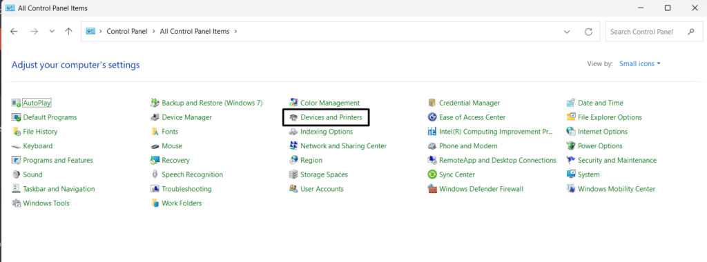 1.啟動控制面板應用程序在您的 PC 或筆記本電腦上並導航至設備和打印機。