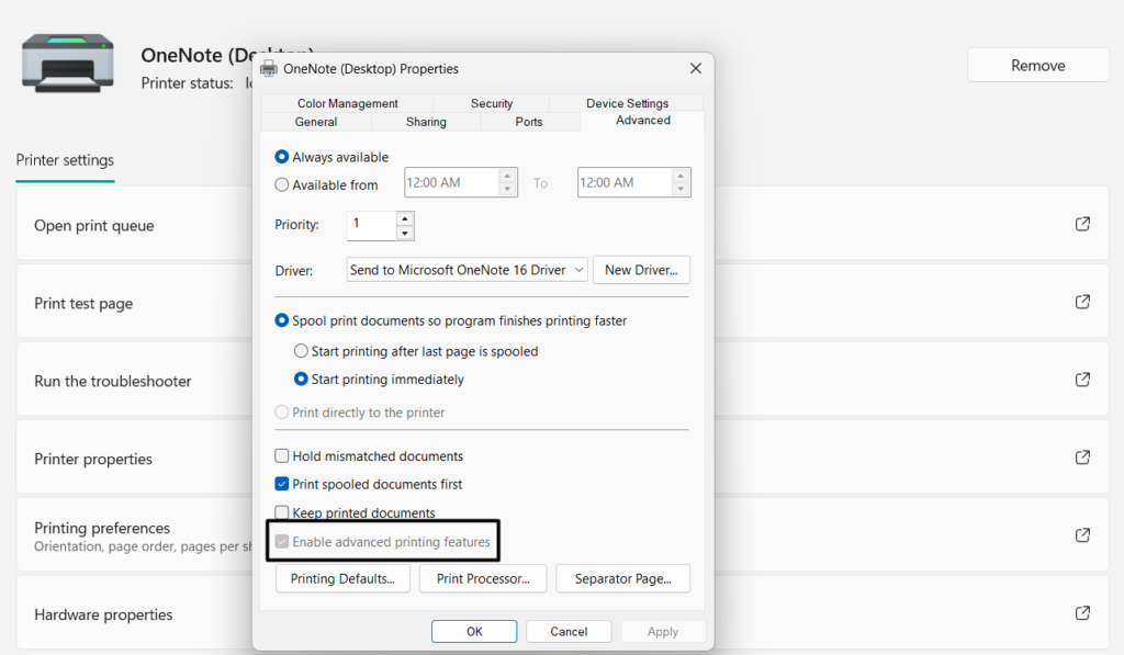 3.移至先進的選項卡並取消選中啟用高級打印 特徵選項。