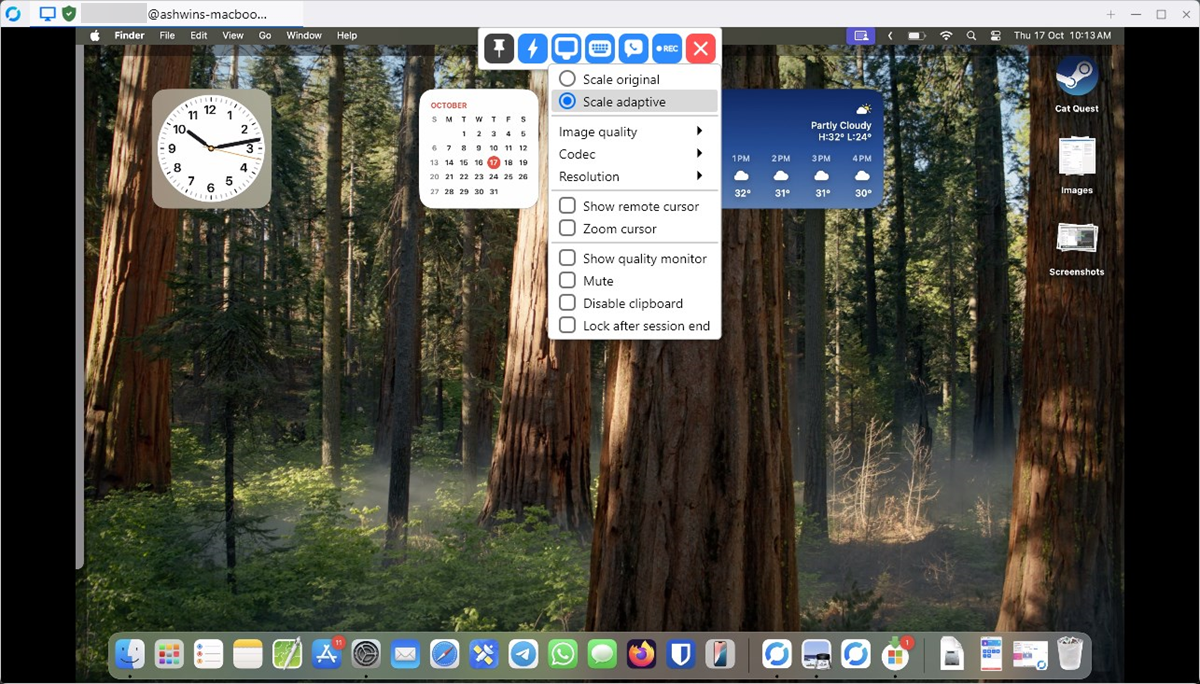 現在,您可能還需要解決一個問題。 Mac 的屏幕可能看起來像是被放大了。要解決此問題,請單擊屏幕頂部 RustDesk 欄中的向下箭頭圖標。單擊“監視器”圖標以訪問顯示設置,然後選擇“縮放自適應”。這應該會以遠程顯示器的正確分辨率顯示 Mac 的顯示屏。
