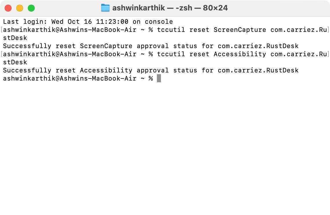 在互聯網上進行搜索後,我偶然發現了文件應用程序支持網站上的頁面。相關網頁使用過時的屏幕截圖和舊的系統偏好設置應用程序。但該頁面上的信息很有用,它提到由於某些 macOS 安全策略、RustDesk 用於捕獲輸入的 API 的更改,以及本節下方的兩個命令將在終端中使用,以通過透明度、同意和控制框架 (TCC) 授予可訪問性和屏幕錄製權限。