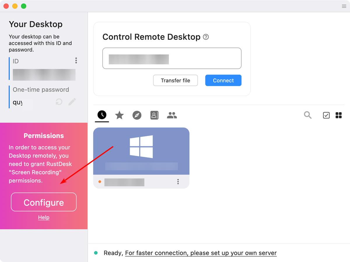應用程序左側的側邊欄會顯示一條消息,通知用戶配置 macOS 的“設置”以允許屏幕錄製權限。它用於遠程共享屏幕。但是,修改“隱私和安全”以及“輔助功能”下的選項並沒有幫助。應用設置後重新啟動 Mac 並沒有解決問題。我們都使用最新版本的 RustDesk,因此沒有更新應用程序的選項。