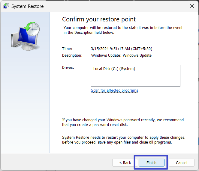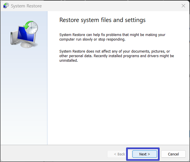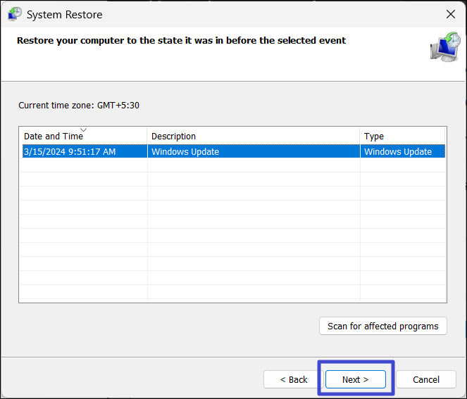 3. 選擇在開始遇到閃爍問題之前創建的還原點,然後單擊“下一個”。