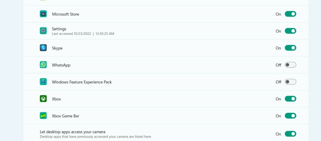 3.在下一個窗口中,確保相機訪問啟用切換,然後搜索Skype應用程序。