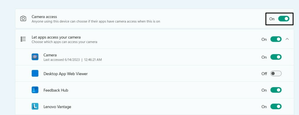 4.確保旁邊的切換開關Skype應用程序在讓應用程序訪問您的相機部分已打開。