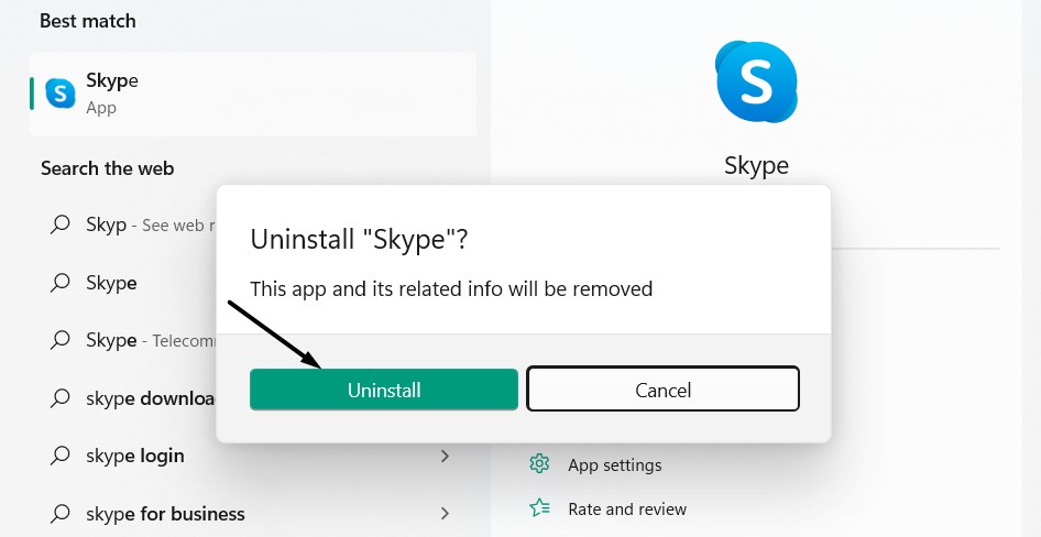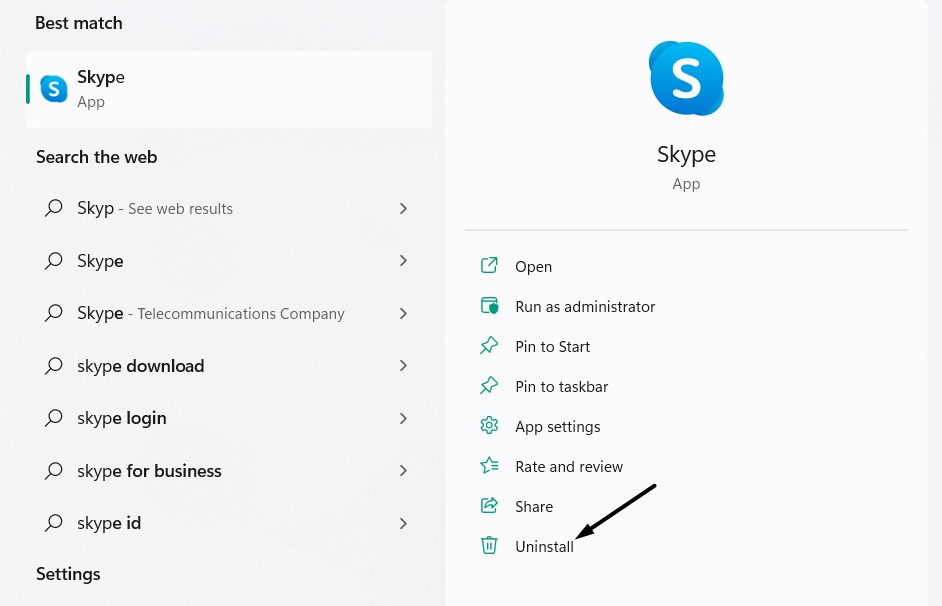 1.搜尋Skype應用程序使用 Windows 搜索並單擊解除安裝結果中的按鈕。