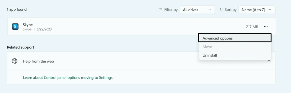 3.單擊三個點 (……)旁邊的Skype應用程序並選擇高級選項從菜單中。