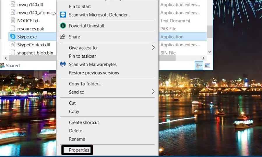 C:Program FilesWindowsAppsMicrosoft.SkypeApp_15.92.3204.0_x86__kzf8qxf38zg5cSkype2.到達那里後,右鍵單擊Skype應用程序,然後選擇特性從上下文菜單。