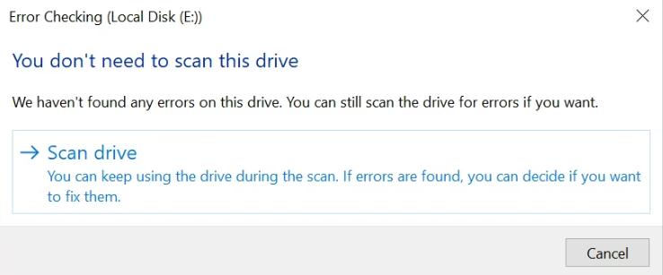 Windows 是否已發現驅動器上的任何故障都會向您告知。您可以掃描驅動器以糾正發現的任何問題。否則 Windows 會警告您不要這樣做。話雖如此,如果您想在任何情況下掃描磁盤,只需單擊對話框中的掃描驅動器即可。結果將開始 CHKDSK 掃描。