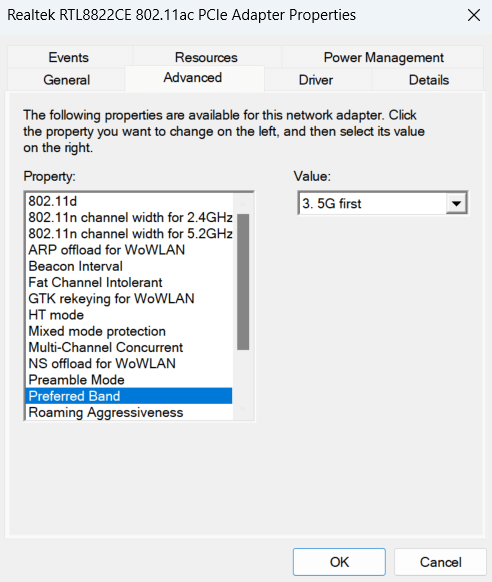 - 在下面財產向下滾動一點並單擊首選頻段。