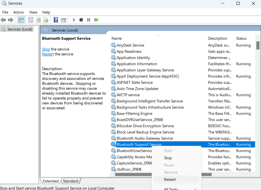 - 定位藍牙支持服務,右鍵單擊它並單擊重新啟動。
