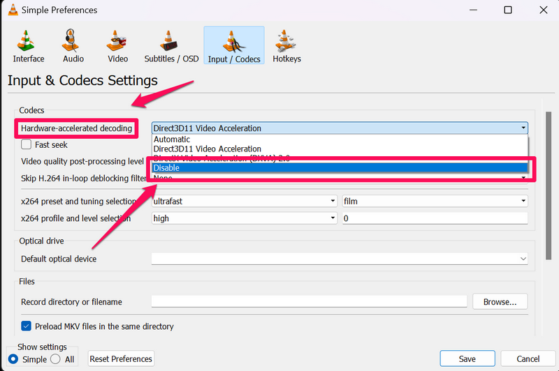3.在這裡,單擊旁邊的框硬件加速解碼編解碼器部分下的選項,然後選擇禁用下拉列表中的選項。