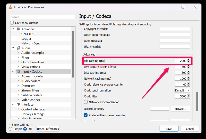 1. 按照步驟 1-4 操作從之前的修復(修復#3)導航到高級部分的輸入/編解碼器VLC 媒體播放器中的設置。