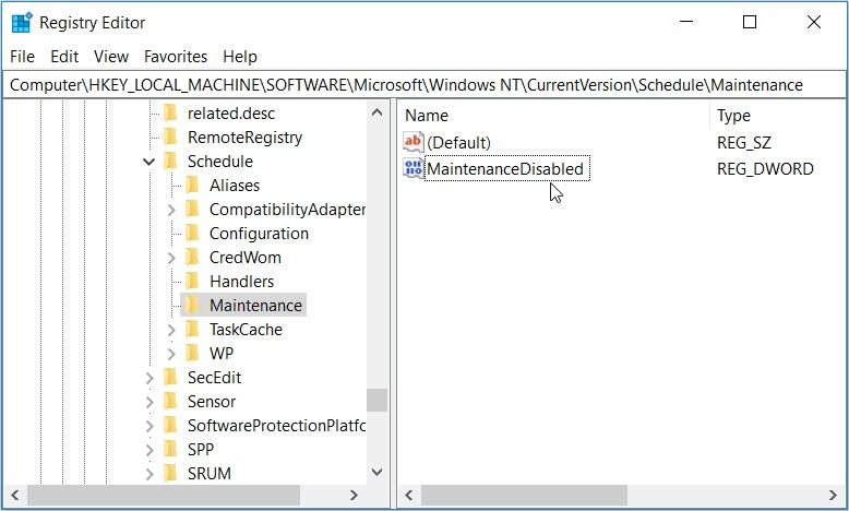 HKEY_LOCAL_MACHINE > SOFTWARE > Microsoft > Windows NT > CurrentVersion > Schedule > Maintenance.