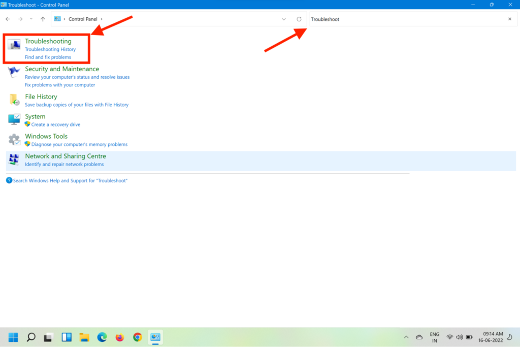 3.在控制面板窗口中,輸入排除故障在頂部的搜索框中輸入並按 Enter 鍵。