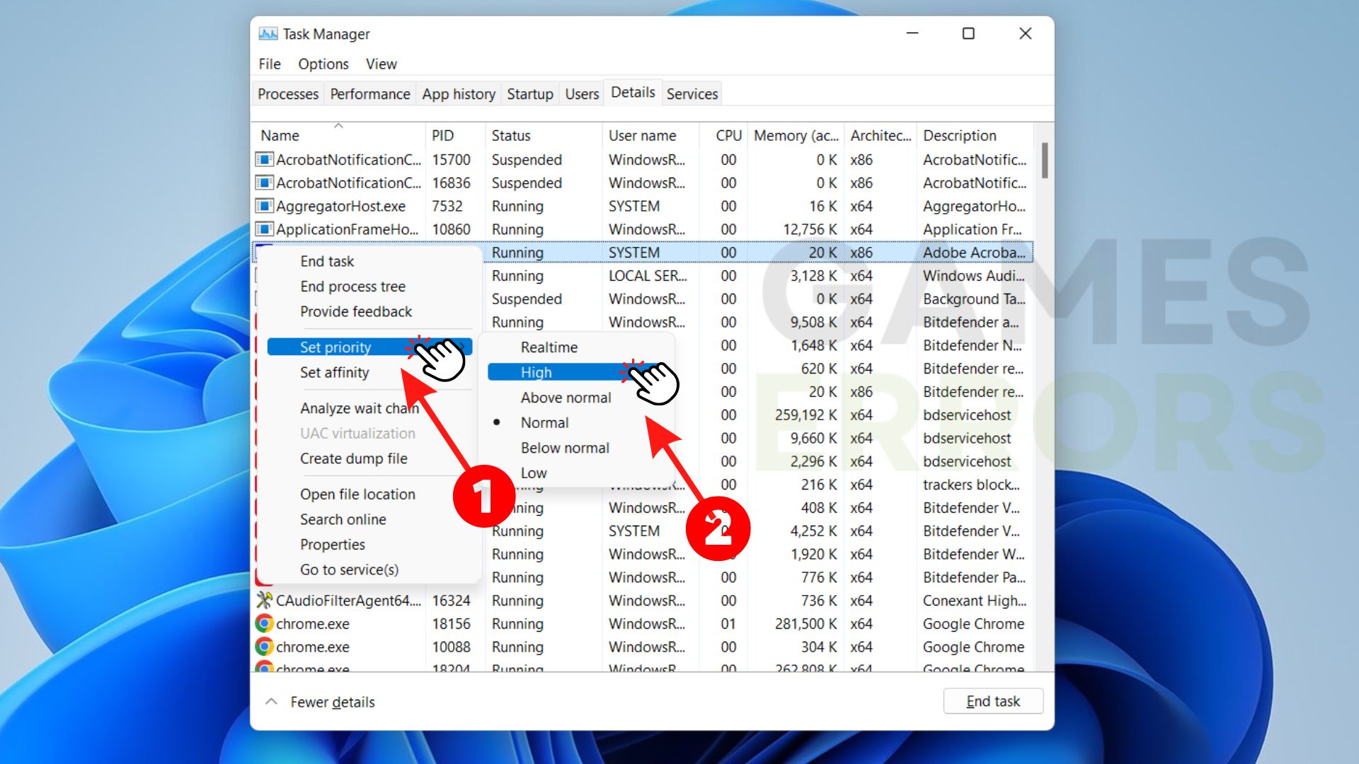 - 要將 WoW 設置為高優先級,請返回工作管理員並選擇細節選項卡。