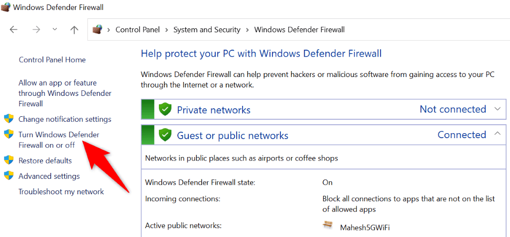 - 選擇打開或關閉 Windows Defender 防火牆在左側邊欄中。