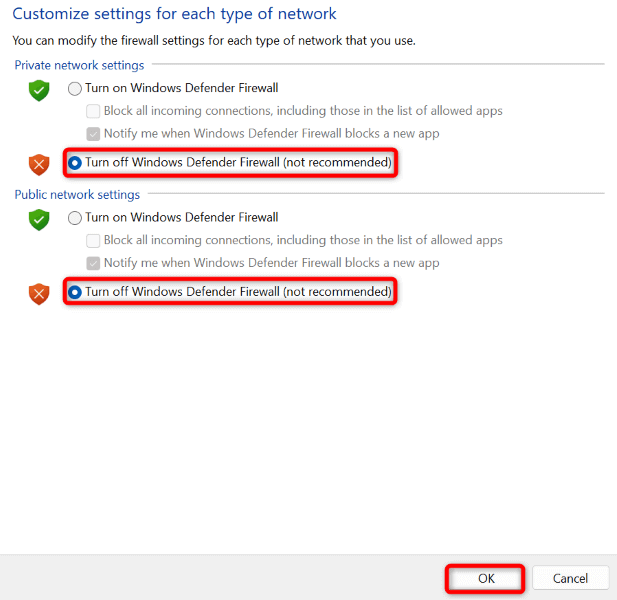 - 啟用關閉 Windows Defender 防火牆(不推薦)兩個選項中的專用網絡設置和公共網絡設置部分。