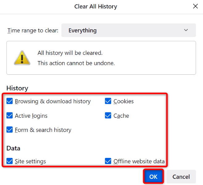 發射設定在 Firefox 瀏覽器中並選擇隱私與安全>清除歷史記錄。選擇要刪除的項目並選擇好的。