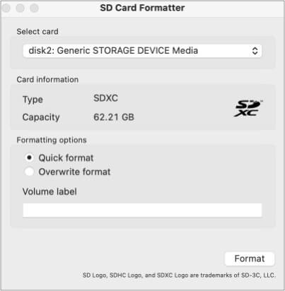 SD卡格式化器是 SD Association 推出的免費應用程序。該軟件負責處理技術工作,這樣您就不會屈服於技術細節。該軟件最好的一點是它支持幾乎所有 macOS(macOS X 10.7 Lion 或更高版本)。