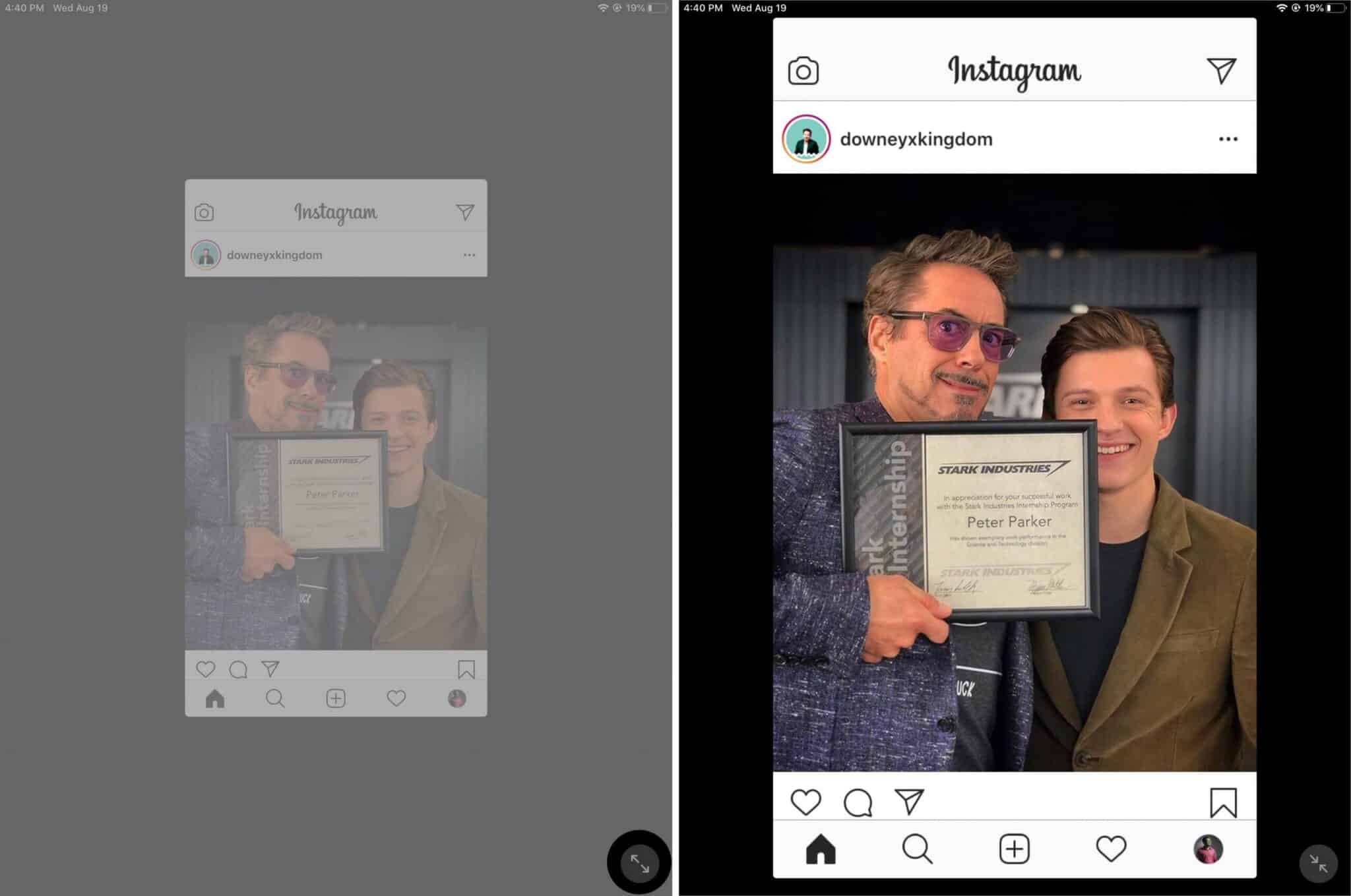 可以看到Instagram應用已經佔據了iPhone的分辨率。這是因為他們還沒有為 iPad 開發特定的應用程序。但是,您可以將分辨率更改為 2 倍,這將使應用程序看起來放大。為此,請點擊向外的箭頭應用程序右下角的按鈕。