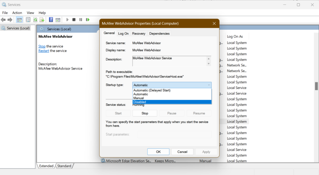 是的,您可以禁用 McAfee,而無需卸載它。為此,您需要停止所有正在運行的 McAfee 服務並禁止它們再次自動啟動。禁用是必要的,因為每當您重新啟動計算機時,McAfee 都會自動啟動,並且任務管理器中沒有任何選項可用於禁用其自動啟動設置。
