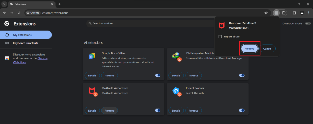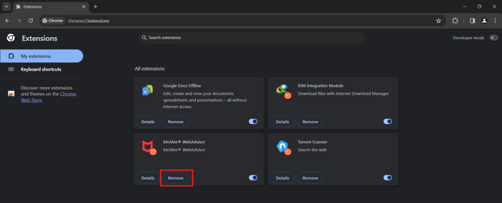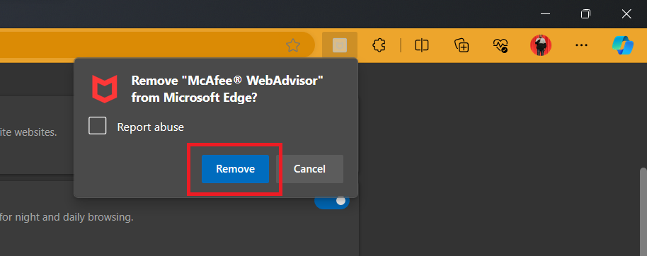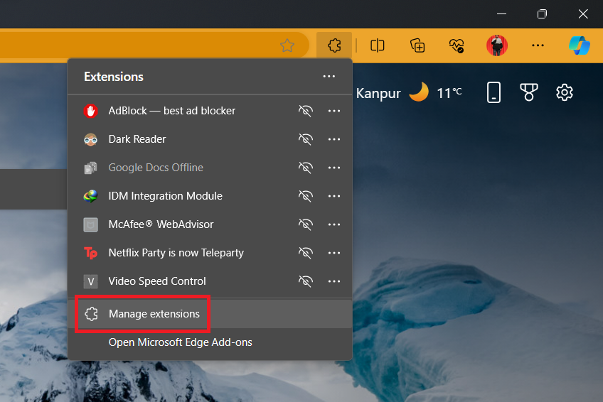 在我們的測試中,我們發現此擴展程序是瀏覽器上所有煩人的 McAfee 彈出窗口的罪魁禍首。現在,您可以通過從默認瀏覽器中刪除擴展程序來輕鬆擺脫所有 McAfee 瀏覽器彈出窗口。按照以下步驟從 Windows 11 中的 Web 瀏覽器中刪除擴展程序