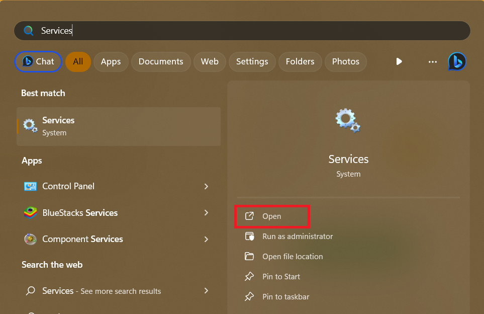 2.搜尋服務並單擊打開按鈕。