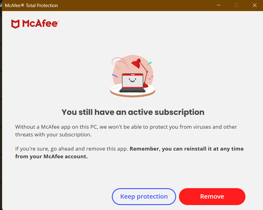 7.如果您有有效的訂閱,邁克菲將在下一個屏幕上通知您,並詢問您是否仍要刪除它。不要猶豫,點擊消除再次按鈕。