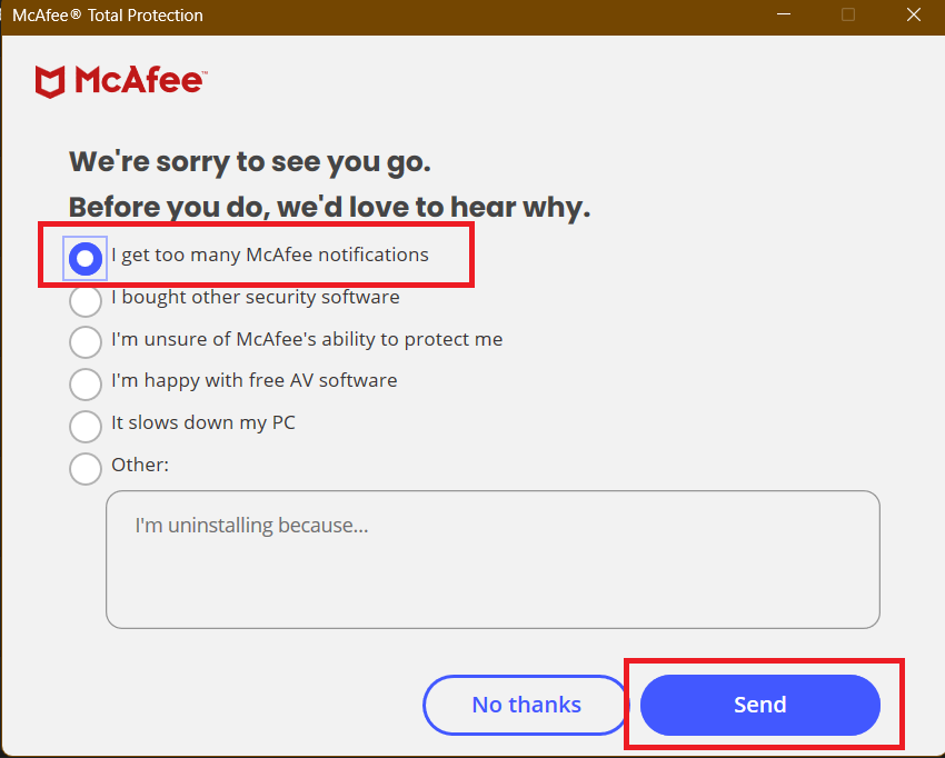 5.它將立即打開 McAfee 卸載程序。如果需要,請選擇我收到太多邁克菲通知,然後單擊發送按鈕。