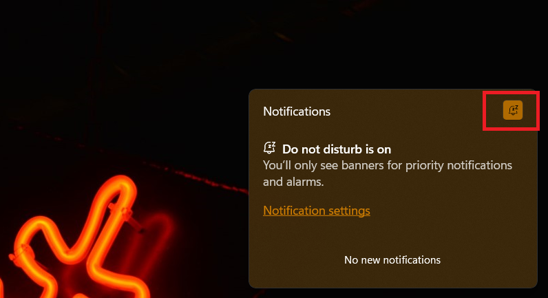 要縮短此過程,請快速打開通知中心通過按贏+N熱鍵並使用 DND 圖標啟用和禁用請勿打擾模式。