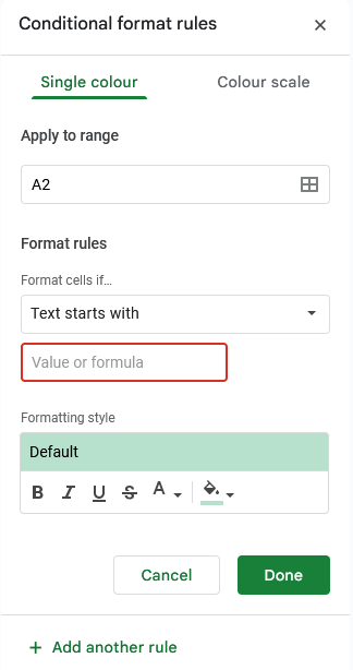 - 在值或公式框中,輸入單元格開頭的特定單詞(或自定義公式)。