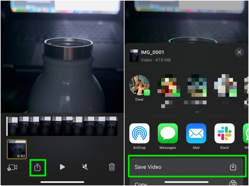 但是,如果您想將 Final Cut Camera 應用中的視頻錄製保存在“照片”應用中在您的 iPhone 上,您可以點擊分享按鈕調出共享表並點擊保存視頻菜單上的選項。